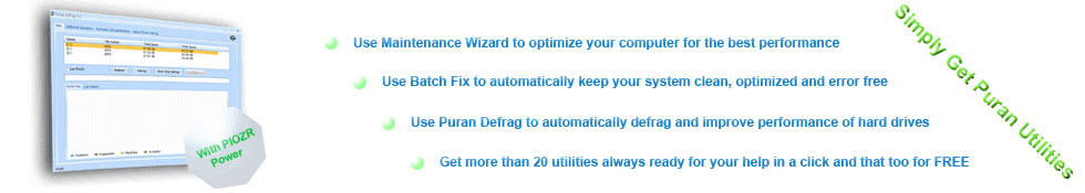 Puran Defrag provides the solution! Puran Defrag is a very simple disk defragmenter which will defrag the files and optimize your system, collecting all the fragments of a file and putting them together, as well as moving some frequently used files and all directories to faster disk areas. This process boosts your hard disk performance and thus overall system speed. In addition it reduces wear and tear on your hard disk, thereby increasing its life span.