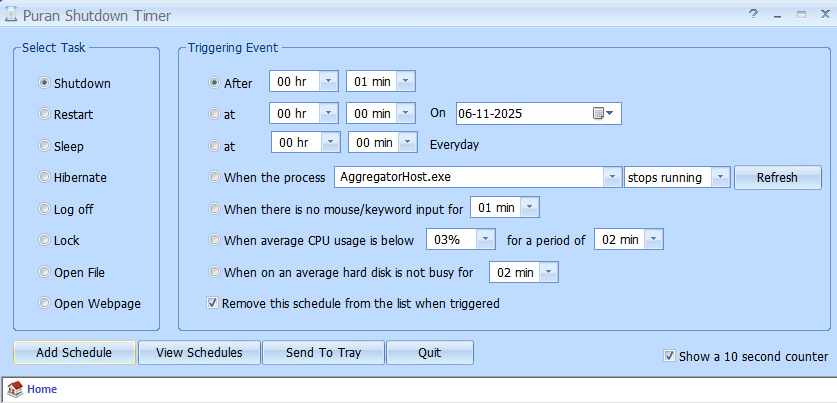 Schedule shutdown/restart/hibernate/log off/sleep/lock.